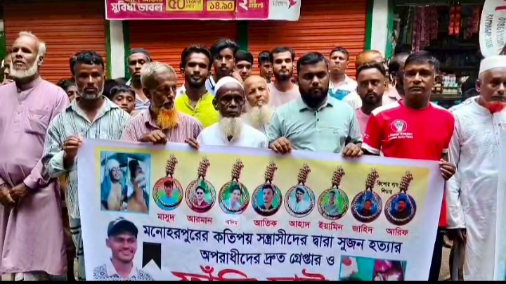 কুমিল্লার শিক্ষার্থী সুজন হত্যার প্রতিবাদে মানববন্ধন প্রকাশিত: ১০:৫৮ অপরাহ্ণ, অক্টোবর ৮, ২০২৫ কুমিল্লা প্রতিনিধিঃ কুমিল্লার ব্রাহ্মনপাড়া উপজেলায় কিশোর গ্যাং এর হামলায় নিহত শিক্ষার্থী সুজন হত্যার বিচারের দাবীতে মানববন্ধন করেছে এলাকাবাসী। বুধবার(০৮-১০-২৫) বিকালে অলুয়া চৌরাস্তা মোড়ে এই মানববন্ধন অনুষ্ঠিত হয়। মানববন্ধনে বক্তব্য রাখেন, নিহতের বাবা আবুল কালাম, নিহতের মা সেলিনা বেগম, স্থানীয় বাসিন্দা মাহাম্মদ পুলিশ,মনতাজ মেম্বার, সোহেল ভূইয়া, নজরুল মাষ্টার, ইউনুস মেম্বারসহ অন্যান্যরা। এসময় মানববন্ধনে বক্তরা, সংঘবদ্ধ ভাবে কিশোর গ্যাং এর হামলায় নিহত সুজনের হত্যাকারীদের ২৪ ঘন্টার মধ্যে গ্রেফতারে করতে প্রশাসনের হস্তক্ষেপ কামনা করেন। Download News PhotoCard SHARES অন্যান্য বিষয়: