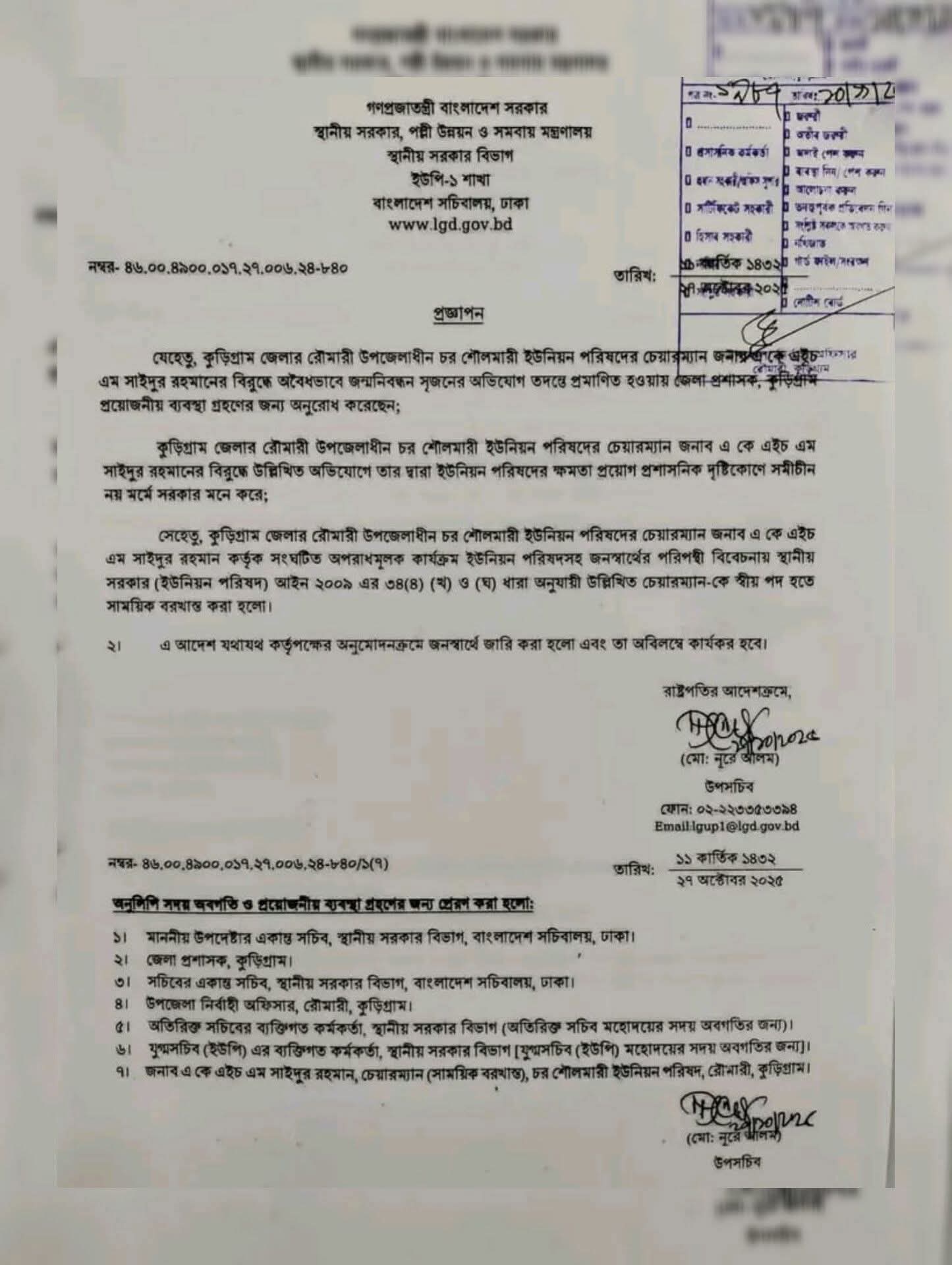 কুড়িগ্রামের রৌমারীতে অবৈধভাবে জন্মনিবন্ধন করায় ইউপি চেয়ারম্যান বরখাস্ত প্রকাশিত: ৮:১০ পূর্বাহ্ণ, নভেম্বর ১১, ২০২৫ কুড়িগ্রাম প্রতিনিধিঃ কুড়িগ্রাম জেলার রৌমারী উপজেলায় অবৈধভাবে জন্মনিবন্ধন করার অভিযোগে চরশৌলমারী ইউনিয়ন পরিষদের চেয়ারম্যান এ কে এইচ এম সাইদুর রহমানকে সাময়িক বরখাস্ত করা হয়েছে। সোমবার (১০ নভেম্বর) সন্ধ্যা সাড়ে ৭টার দিকে বিষয়টি নিশ্চিত করেছেন কুড়িগ্রাম জেলার রৌমারী উপজেলা নির্বাহী কর্মকর্তা (ইউএনও) উজ্জ্বল কুমার হালদার। রাষ্ট্রপতির আদেশক্রমে উপসচিব মো. নূরে আলমের স্বাক্ষরিত প্রজ্ঞাপনে বলা হয়, কুড়িগ্রাম জেলার রৌমারী উপজেলাধীন চর শৌলমারী ইউনিয়ন পরিষদের চেয়ারম্যান এ কে এইচ এম সাইদুর রহমানের বিরুদ্ধে অবৈধভাবে জন্মনিবন্ধন সৃজনের অভিযোগ তদন্তে প্রমাণিত হওয়ায় প্রয়োজনীয় ব্যবস্থা নেওয়ার জন্য সুপারিশ করেছেন কুড়িগ্রাম জেলা প্রশাসক। প্রজ্ঞাপনে আরও উল্লেখ করা হয়, ইউপি চেয়ারম্যান এ কে এইচ এম সাইদুর রহমানের বিরুদ্ধে উল্লিখিত অভিযোগে তার দ্বারা ইউনিয়ন পরিষদের ক্ষমতা প্রয়োগ প্রশাসনিক দৃষ্টিকোণে সমীচীন নয় মর্মে সরকার মনে করে। তার এই অপরাধমূলক কার্যক্রম ইউনিয়ন পরিষদসহ জনস্বার্থের পরিপন্থী বিবেচনায় স্থানীয় সরকার (ইউনিয়ন পরিষদ) আইন ২০০৯ এর ৩৪(৪) (খ) ও (ঘ) ধারা অনুযায়ী তার পদ থেকে সাময়িক বরখাস্ত করা হলো। এ আদেশ যথাযথ কর্তৃপক্ষের অনুমাদনক্রমে জনস্বার্থে জারি করা হলো এবং তা অবিলম্বে কার্যকর হবে। জানা গেছে, চেয়ারম্যান এ কে এইচ এম সাইদুর রহমান অবৈধভাবে প্রায় ৪৫০টি জন্মনিবন্ধন সনদ তৈরি ও বিতরণ করেছেন। এসব সনদধারীদের শনাক্ত করতে পারেননি স্থানীয় ইউপি সদস্য, গ্রাম পুলিশ কিংবা এলাকার বাসিন্দারা। এ বিষয়ে সাময়িক বরখাস্ত হওয়া চেয়ারম্যানের মোবাইল ফোনে একাধিকবার যোগাযোগের চেষ্টা করেও তাকে পাওয়া যায়নি। বিষয়টি নিশ্চিত করেছেন রৌমারী উপজেলা নির্বাহী কর্মকর্তা (ইউএনও) উজ্জ্বল কুমার হালদার বলেন, “প্যানেল চেয়ারম্যানকে দায়িত্ব দেওয়ার জন্য ইউপি সচিবকে যাবতীয় কার্যক্রম সম্পন্ন করার জন্য বলা হয়েছে। Download News PhotoCard SHARES সারা বাংলা বিষয়: